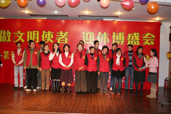 第十二个“国际志愿者日”到来之际,杭州团市委、杭州市青年志愿者协会、西博办等部门联合召开了“2005西博会”志愿者工作表彰大会,隆重表彰了在西博会志愿服务行动中做出杰出贡献的个人和集体,我校青年志愿者总队被评为第七届“西博会志愿者行动先进集体”,校青年志愿者总队队长申屠汝曦同学获得“西博会十佳志愿者”荣誉称号,杨晓芸等45名同学被评为“西博会优秀青年志愿者”,占获奖总人数的15%。目前,在历届西博会中,我校已有百余名同学获得先进个人表彰,在杭州各高校中表现突出。