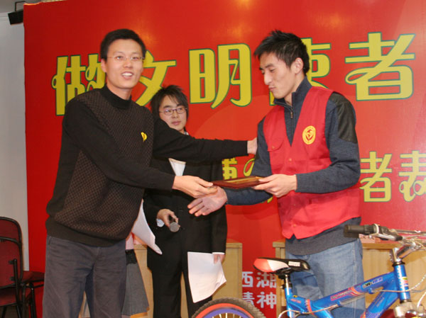 表彰大会上还进行了一场别开生面的“超级志愿者PK大赛”,围绕西博会、休博会、文明礼仪等内容展开,我校申屠汝曦同学和浙工大等其他院校的6名志愿者同台竞技,经过知识问答、抢答、模拟表演、即兴演讲等几个环节,申屠汝曦同学以绝对优势胜出,夺得“超级志愿者”冠军大奖。