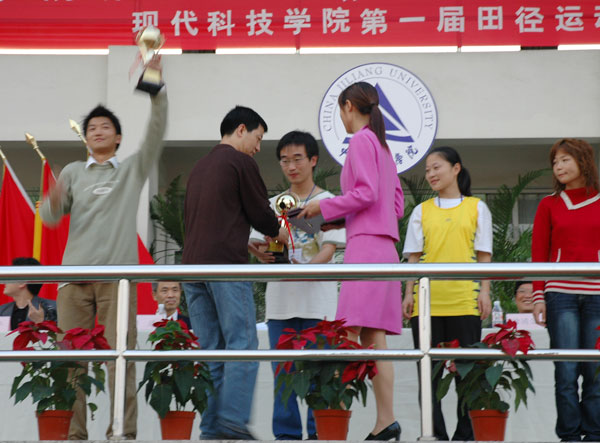 经过两天的激烈角逐,我校第二届运动会暨第十九届田径运动会、现代科技学院第一届田径运动会划上了圆满的句号。党委副书记于永明、徐涌金,副校长吕进、侯宇等党政领导出席了闭幕式,党委委员陶伟华、陈希武参加了闭幕式。副校长侯宇致闭幕词。 侯宇指出,本届运动会开幕式阵容强大,从容有序,表演项目精彩纷呈;赛场上广大运动员秉承奥运精神,努力向着“更高、更快、更强”的目标,勇于拼搏、敢于超越,高潮迭起、喜讯频传,充分展示了我校体育健儿团结协作、顽强拼搏的风采,展示了全校师生积极进取、奋发向上的精神风貌。本届运动会的成功举办,必将对我校全民健身运动和体育事业的进一步发展产生积极的推进作用。侯宇希望全校各单位(部门)能借着本届运动会成功举办的东风,再展智慧与活力,把赛场上这种顽强拼搏、奋发向上、团结协作的精神和坚持不懈的意志带到今后的工作中去,努力把我校的各项工作做得更好;希望广大同学刻苦钻研,勤学苦练,进一步营造出你追我赶,不甘落后的浓郁的学习氛围,努力使自己成长为高素质的全面发展人才!同时,他也希望全校师生员工继续积极参加体育运动,锻炼健康体魄,为更好地工作、学习、生活打下良好的基础,以昂扬的斗志和饱满的热情,切实行动起来,为把我校建设成为国内知名的教学研究型大学做出应有的贡献! 最后,机电工程学院以总分294.5分获得我校第二届运动会暨第十九届田径运动会、现代科技学院第一届田径运动会学生组团体总分第一名,信息工程学院、管理学院、我院技术工程学院分获二、三、四名;信息工程学院分工会以总分163.5分获得教工组团体总分第一名,机关分工会、机电工程学院分工会、后勤服务公司分工会分获二、三、四名。