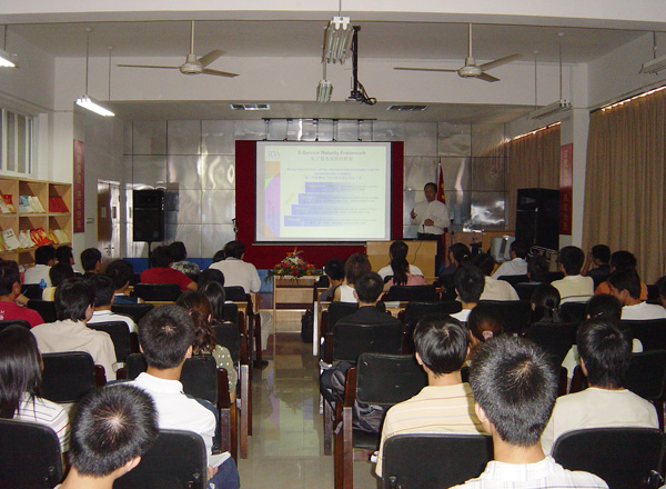 9月29日下午,新加坡驻上海领事馆信息产业领事莫文波先生来我校访问。党委副书记、常务副校长方志刚在明德南楼A209会见了莫文波先生一行,并与莫文波先生进行了亲切的会谈。国际交流合作处吴宏宽副处长和信息工程学院党总支书记傅洪健、副院长金尚忠、陈晓竹等参加了会见。 随后,莫文波先生在信息工程学院党政领导的陪同下参观了校园,并在图书馆夏哲雷馆长的介绍下参观了图书馆电子阅览室、主书库等。 下午3:30,莫文波先生在赛博南楼412会议室为我校师生作了题为《新加坡信息产业和电子政务的发展》的报告。他从信息产业和电子政务的背景、电子政务带来的效益等方面全面阐述了新加坡信息产业和电子政务的发展现状,并提醒我校喜欢IT行业的学生要“早接触”、积极主动“创造机遇”、及时准确地“把握信息时代的前沿”。 莫文波先生精彩的报告得到了全场师生的热烈掌声。