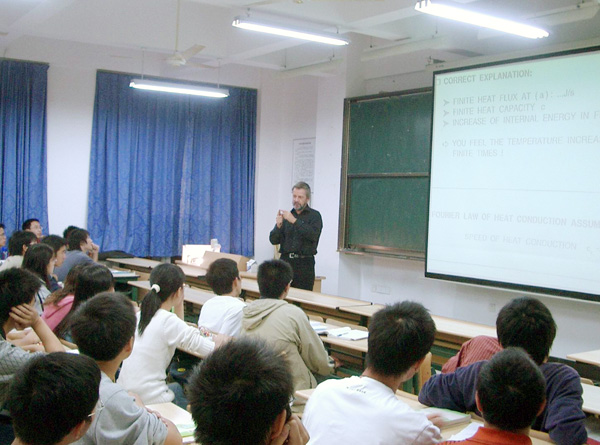 10月19日上午,我校在明德楼B六楼会议室举行聘任仪式,聘请德国汉堡工业大学海因策•赫维希(Heinz•Herwig)博士为我校客座教授。吕进副校长代表学校向海因策•赫维希博士颁发了聘书,我院技术工程学院院长李东升教授、副院长周静伟、李文军以及我院技术工程学院的部分教授、博士出席了聘任仪式。 海因策•赫维希教授是德国工程热物理领域的著名学者,先后在德国波鸿大学、开姆尼兹大学、汉堡工业大学担任教授,主要从事传热传质强化、流体力学、微通道传热与流动、流动测试与数值模拟等研究。近些年已由世界著名的Springer出版社出版专著四部,发表SCI论文100余篇,在各种国际会议上多次作特邀主题报告,主持多项德国科学基金(DFG)项目,兼任很多种国际刊物的编委或审稿人。 在聘任仪式上吕进副校长首先代表学校对海因策•赫维希博士来校访问表示热烈欢迎,并对海因策•赫维希博士接受邀请担任我校客座教授表示诚挚的谢意。吕进在讲话中指出,我校与德国高校及PTB等科研机构有良好的合作,希望双方在今后能进一步加强沟通和了解,不断拓宽合作领域并取得更多实效。吕进也希望海因策•赫维希博士今后多来我校讲学,为我们带来更多的新知识、新视野。 聘任仪式结束后,海因策•赫维希教授为我校师生作了题为“Local Entropy Production in Turbulent Shear Flows: A Tool for Evaluating Heat Transfer Performance(湍流剪切流中局部熵产:评价传热性能的一种工具)”和“High Education in Germany(德国高等教育概况)”的两场学术报告。 当天晚上,海因策•赫维希教授应邀在翔宇楼304教室为我校师生开设了题为“How fast does the heat travel?”的传热学观摩课,来自热能与动力工程专业、测控技术与仪器专业的百余名同学和热能工程学科的部分教师参加了教学观摩。海因策•赫维希教授采用启发式的教学方法深入浅出地讲解,注重将自己最新的科研成果介绍给学生、鼓励学生思考提问、告诫学生不要盲目地迷信书本杂志中的看到的东西。观摩课给大家留下了很深刻的印象。