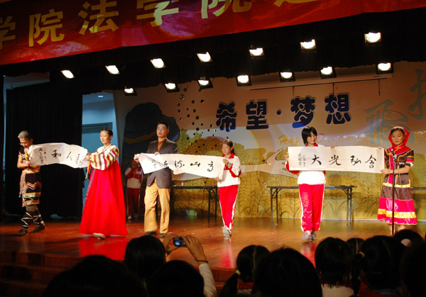 为了欢迎来自五湖四海的新同学,使他们感受到人文社科学院、法学院的温暖与热情,10月25日晚,人文社科学院携手法学院倾情上演了一出别开生面的迎新晚会,晚会在学生活动中心多功能厅举行。校党委副书记于永明应邀出席了会议。人文社科学院党总支书记张新建、法学院院长王艳林、人文社科学院党政办公室主任黄建湖、法学院党政办公室主任李佳、人文社科学院及法学院辅导员等参加了晚会。 晚会在充满活力与时尚的模特秀中拉开了序幕。优美的舞姿,嘹亮的歌声,雅俗共赏的相声等在新生的心中演绎着欣喜和感动。05级新生带来的传统优美的朝鲜族舞蹈,悦耳缭绕的葫芦丝,典雅的古筝独奏,妙笔生花的书法表演等节目不仅丰富了晚会的内容,也体现了新生们的多才多艺。同学们八仙过海,各显神通,上演了一出出精彩纷呈的节目。此外,本次晚会的一群特殊佳宾――彭埠二小的小朋友带来的极富童趣的节目表演,使晚会成为了欢乐的海洋。最后晚会在舞蹈《骏马》中圆满结束。 此次05迎新晚会展示了当代青年大学生的良好风貌,为学院间的才艺交流提供了一个难得平台,也开创了各学院协作开展活动的先例。