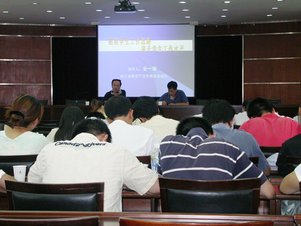 金一斌处长在报告中谈了近期我省高校大学生思想政治工作中出现的问题,以及高校大学生思想政治工作的思路。他指出,学生工作最重的压力是稳定、最大的难题是统筹、最强的优势是作风、最好的财富是队伍。金处长对我校的学生工作予以了肯定,认为我校近年来学生工作扎实、工作深入、善于学习、善于总结、特色明显。他强调,学生工作中要明确一个目标,两个重点,把握抓龙头、抓苗头、抓源头三个着力点,破四个工作难点。在高校思想政治工作中要抓机遇、抓机制、抓队伍,要紧紧围绕大学生的特点,倚重法的规范,夯实建的基础,强化带的环境,拓展人的内涵,活用统的办法,提高创的水平。他希望大家在以后的工作中,多总结亮点,多搭建交流的平台,多压一些工作的担子,进一步提升我校的学生工作水平。