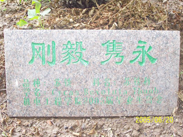 在2005届毕业生顺利完成学业,即将离校之际,怀着对学校的无限眷恋,对老师的深深感激,对同学的依依不舍,近日,机电工程学院毕业生在后勤服务公司绿化办老师的大力支持下,自发进行了种树留念活动。 机电工程学院05届毕业生共同在环宇楼北面种了一棵铁树,立碑“刚毅隽永”四个字,用这种特殊的方式来表达对母校的留恋之情,希望能将这一段亮丽的青春变为永恒的记忆。与此同时,01电气3班和03自动化3班的同学在老师的带领下在生活区宿舍楼下种了两棵香樟树,立碑“十年树木,百年树人”来表达对母校的热爱。 毕业生们纷纷表示,在离别的日子里,种树仅仅是一种形式,大家想借此表达对学校领导关心、厚爱的感谢之情,表达对所有任课老师和辅导员传道授业、谆谆教导的感激之情,表达对学校未来的衷心祝福。