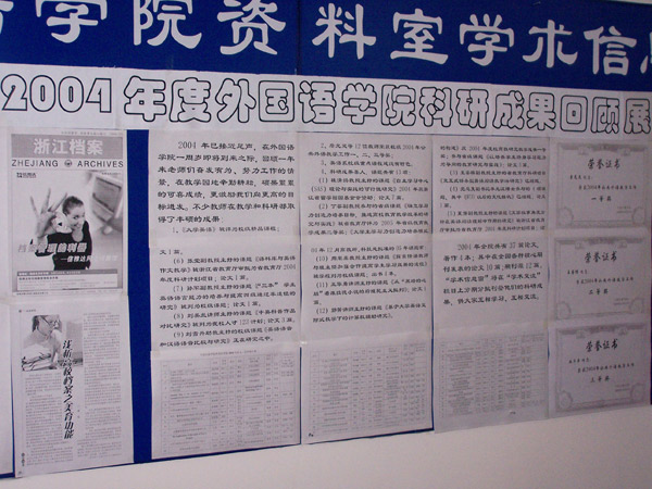 外国语学院成立至今已一年时间,回顾一年来全院教师团结努力、积极进取,在教学和科研中取得了可喜的成绩。为了推动学院的科研活动,激励教师确立更高的目标,该学院于12月23日举办了“2004年度外国语学院科研成果回顾展”。此次展览全面展出了该学院校级精品课程、校级重点课程的建设情况及学院的科研成果。据悉,该学院的“学术信息服务窗”也将在“学术交流”栏目上分期、分批刊登学院教师的科研成果。
