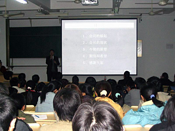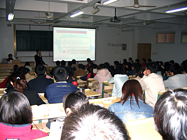 王培永总经理以“从日本软件外包看IT人才国际化”为主题,围绕当今软件行业的发展背景、发展现状、发展前景以及对软件工作人员现状分析和人才需求展望等内容为同学们上了生动的一课。凌晨总经理则为同学们介绍了该公司的缘起、现状、展望,并提出了对IT人才的具体要求、期待和希望,最后以“立大志软件报国”勉励广大同学们学好专业知识,在软件开发领域作出更大的贡献。