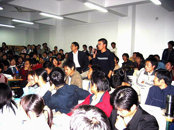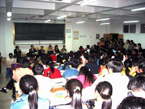 熊明华首先对考研中应注意的问题做了全面的阐述,接着江东坡博士就选择专业和报考学校等问题讲述了自己的看法,马会起则通过实例分析来提高同学们考研的积极性,余晓和金芳芳结合学科特点及就业形势进行了进一步的阐述,最后季任天结合自己的考研经历激励同学要在考研路上坚持不懈,充满信心。