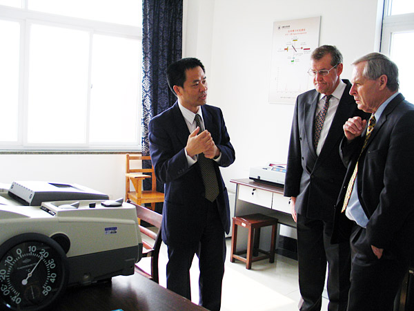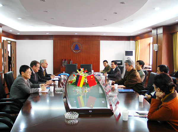 党委书记姚盛德、党委副书记于永明、副校长吕进及学校相关单位负责人与来宾进行了座谈。姚盛德首先代表学校对曼弗雷德•科赫西克教授一行的到来表示欢迎,并对其10多年来对学校的关心和厚爱表示感谢。姚盛德说,德国联邦物理技术研究院为我校师生提供了很多国际上最新的学术信息和出国交流的机会,吕进副校长、机电工程学院陈乐院长、管理学院宋明顺院长等不少学校的学术骨干都曾经在PTB工作过,PTB良好的工作环境不仅使他们开拓了视野,更是使他们拥有了先进的学术理念,对其今后的发展大有裨益。作为学校的客座教授,姚书记希望曼弗雷德•科赫西克教授今后能多来学校参观讲学,并对学校的发展一如既往的给予关心和支持。