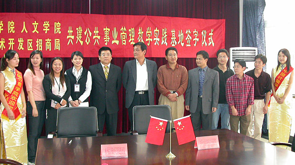 10月14日下午,人文学院在格致南楼A205室与杭州经济技术开发区招商局签订协议,共建公共事业管理教学实践基地。人文社科学院党总支书记张新建、副院长周泛海、公共事务系主任杨晨,杭州经济技术开发区招商局副局长兼招商中心主任钱骏等出席了签字仪式。张新建和钱骏代表双方签署了合作协议。