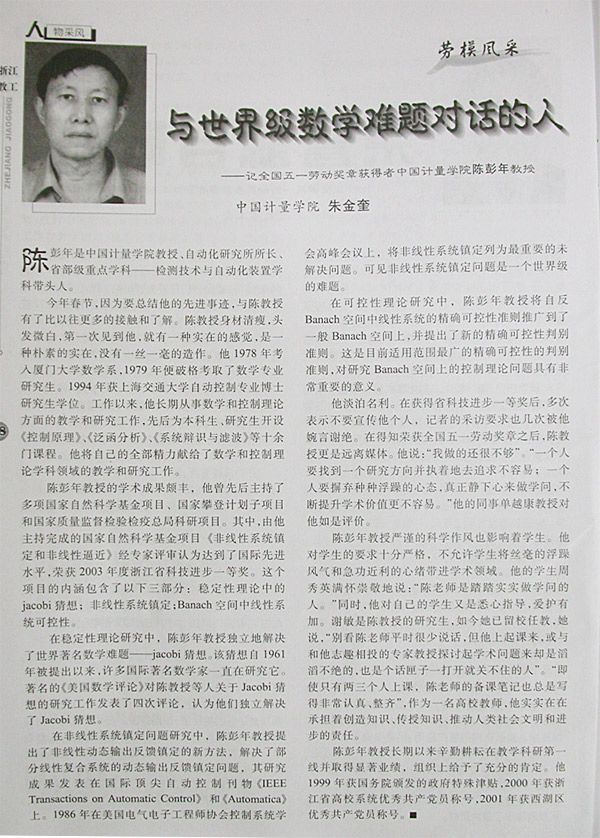 我校陈彭年教授作为封面人物出现在2004年第3期《浙江教工》杂志上。与此同时,该期杂志还在人物风采栏目刊发了题为《与世界级数学难题对话的人——记全国五一劳动奖章获得者中国我院学院陈彭年教授》的文章,介绍了我校陈彭年教授的先进事迹及获得的显著成绩。