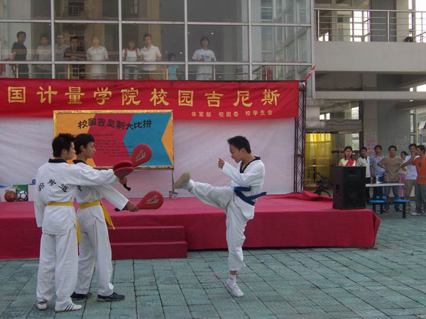 主场地前搭了舞台,两名主持人不时地介绍各个项目的报名和比赛情况,中间穿插了跆拳道、吉他弹唱等助兴节目。场地上,各个项目报名的同学都十分踊跃,在转呼啦圈的比赛里,十分钟的比赛时间,参赛的六名同学伴着动感的音乐转起呼啦圈,技术娴熟,动作优美,让比赛成了一种表演。最后,林芳芳同学以十分钟旋转1400多圈的成绩获得了冠军。参加俯卧撑比赛的同学一开始只有三名,当其他两名同学都体力不支结束比赛时,仍有一位穿红色运动服的同学一直坚持着,在他的精神的感染下,不少同学上台一展身手,一些女生也自告奋勇地参加了比赛。在集体跳长绳的比赛中,同学们纷纷以班级、学生会等形式组队上场,参赛团队配合默契,出色的表现也得到了现场观众阵阵热烈的掌声。