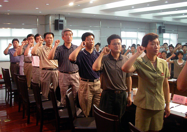 伴随着庄严的《国际歌》,仪式正式开始。全体党员首先在00测2班学生查艳的领誓下进行了宣誓。全体学生党员签署了“我院技术工程学院学生党员责任书”。01测控1班的吴丹华代表学生党员进行了发言。
