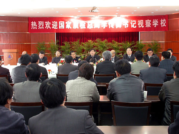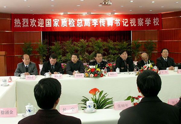 2月27日上午,国家质检总局党组书记李传卿在国家质检总局党组成员、人事司司长安国、国家总局办公厅主持工作的副主任张健伟、监督司司长纪正昆、法规司司长刘兆彬、科技司司长刘平均、动植司副司长卢厚林、党组秘书(副司级)许新建、浙江省质量技术监督局局长戴备军和浙江省出入境检疫检验局副局长李法忠等领导陪同下视察我校。 李传卿书记一行在校党委书记姚盛德,党委副书记、常务副校长方志刚,党委副书记于永明,副校长张硕年、吕进、侯宇,纪委书记陈宏硕,校长助理徐涌金等学校领导的陪 随后,李传卿书记一行在明德楼北6楼会议室与全校中层以上干部见面。他深情地说,进了学校大门,既有回家的感觉,更有做客的感觉。有回家的感觉是因为学校是由国家总局创办、建设、发展起来的,是国家质检行业唯一的本科院校;有做客的感觉是因为学校搬迁到下沙后,整个面貌大变样。学校的面貌不是一般意义上的旧貌换新,而是发生了翻天覆地的变化。学校始终很信赖国家总局,国家总局也始终很留恋学校。他代表李长江局长和国家总局党组向学校全体师生员工致以最亲切的问候,向全校教职工表示最诚挚的感谢并致以最崇高的敬意。他表示,校园一行给他留下极其深刻的印象。亲眼目睹学校的巨大变化,他心情十分激动,有三点感受。第一是很受鼓舞。学校的规模扩大了,实力增强了,教师队伍成熟起来了,社会影响明显扩大了。学校的占地面积达到了一千亩以上,学校教职工人数接近一千人,学校的二级学院已经有12个,学生有一万多人,学校年预算收入达到了1亿多,学校已建设了一批硕士点。这“四个变化”和“六个一”令人很受感动。这些成绩的取得倾注了大家的心血和辛勤的劳动。第二是很有感受。感受到党中央、国务院关于部属院校下放到地方,实行省部共建的决策是完全正确的。浙江省委、省政府对学校的领导和支持,使学校发生了巨大变化。学校也抓住了机遇,实现了思想观念、管理体制、工作思路的转变,按照社会主义市场经济的需要调整了发展思路,按照经济与社会发展的需要来培养人才。第三是很有希望。新一代中央领导集体提出要大力弘扬求真务实精神,大兴求真务实之风,树立科学的发展观、科学的人才观和正确的政绩观。形成这些思想和观念的基础在于教育,而教育的关键在于高校。国家质检事业发展需要大批高素质专业人才,中国我院学院要成为国家质检事业人才培养基地和干部培训基地。中国我院学院前途无量,很有希望,大有希望。 李传卿书记表示,过去国家总局管理学校时,对学校的发展倾注了全力;现在是省部共建,国家总局也将继续全心全意,一如既往地关心学校发展,支持学校发展,为学校发展做好服务。 姚盛德书记代表全校师生员工对国家总局一如既往的关怀与支持表示衷心的感谢。他表示,传卿书记的重要讲话,既是对我们的最大鼓励,也是对我们提出的更高要求,我们将会在实际工作中认真贯彻落实。我们会无时无刻地感受到国家总局领导对我们的关怀与支持,尽全力做好学校各项工作,在提高学校办学水平、办学质量和办学层次等方面尽心尽力,让国家总局放心。同时,我们殷切期盼国家总局继续全力关心支持学校发展。 会后,李传卿书记为学校作了“以质量求生存,以创新谋发展”的题词。 下午,国家质检总局法规司司长刘兆彬教授为我校师生作了题为“贯彻行政许可法,推进依法行政”的学术报告。报告会由校党委副书记于永明主持。
