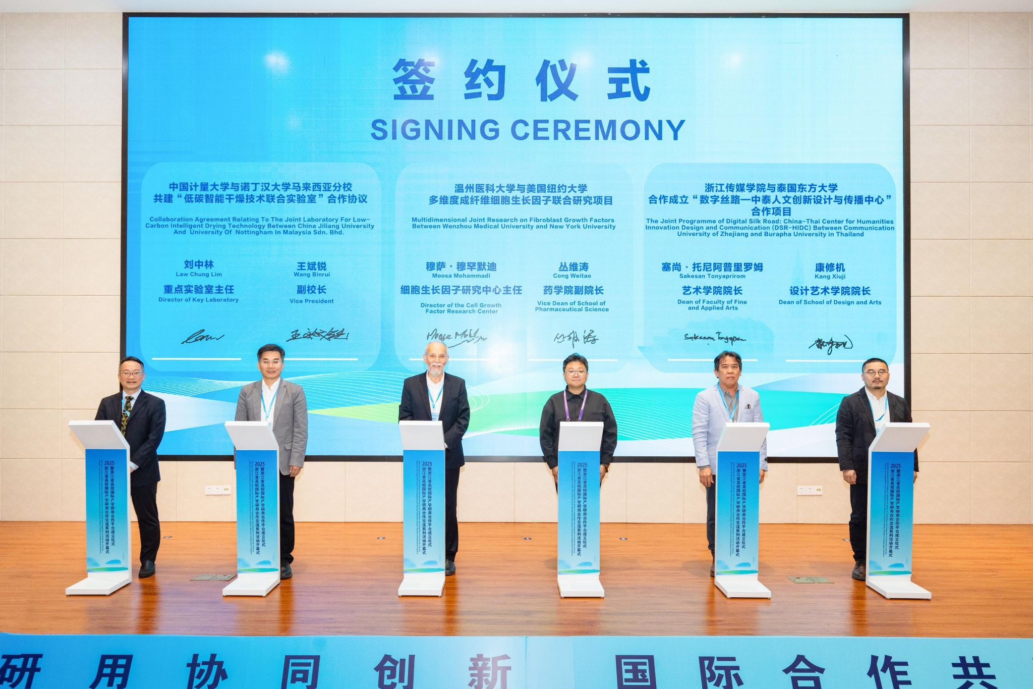 活动期间发布了全省高校国际产学研用合作成果,成立了浙江省高校国际产学研用合作平台,我校和浙江大学、西湖大学、温州医科大学等16所高校成为平台首批成员单位。副校长王斌锐应邀出席国际产学研用合作平台成立启动仪式,并代表学校与诺丁汉大学马来西亚分校重点实验室主任Law Chung Lim签署两校共建“低碳智能干燥技术联合实验室”合作协议。国际交流合作处、机电工程学院、我院测试与仪器学院、能源环境与安全工程学院相关负责人和我校外籍教师代表共同出席活动。